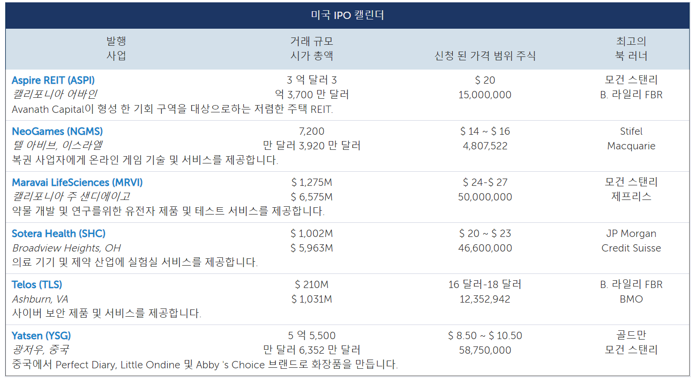 | 미국 증시 IPO 캘린더 (11월 9일 46주차) –생명 공학을 필두로 선거로 멈췄던 기업 공개 개시 (0) | 2020.11.08 |