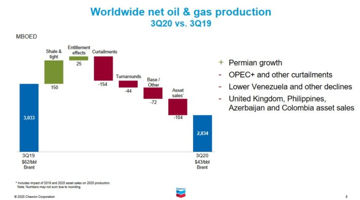 10 월 말 Chevron은 2020 회계 연도 3 분기 재무 결과를 발표했습니다 (20 년 10 월 30 일). 전염병이 전 세계 석유 수요에 미치는 영향으로 인해 순 석유 등가 생산량은 작년 분기 대비 -7 % 감소했습니다.. 상품 가격 약세와 결합된 생산 감소는 2 분기에 2 억 1 백만 달러의 결과를 가져왔는데, 이는 전년 동기의 조정 수입 29 억 달러와 비교했을 때입니다.