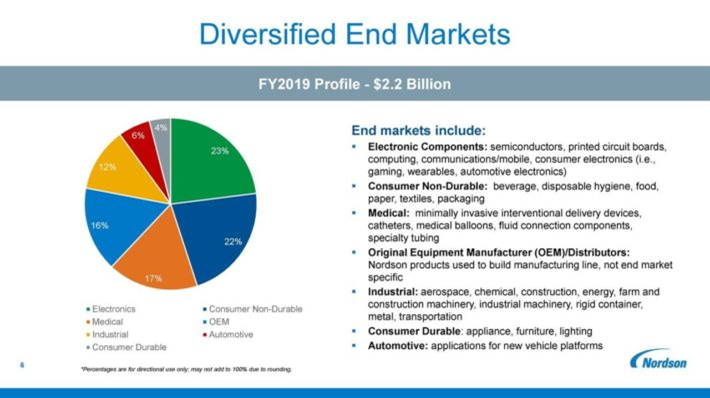 Nordson은 전염병으로 인한 지속적인 침체 시기에 불황에 강한 모습을 보여줬다. 이 회사는 올해 주당 순이익이 5 % 감소 할 것으로 보고 있으며 내년에는 성장 모드로 돌아갈 것으로 예상하고 있다. 따라서 코로나 바이러스 위기의 영향을 거의 받지 않은 극히 소수의 산업 회사 중 하나이다.