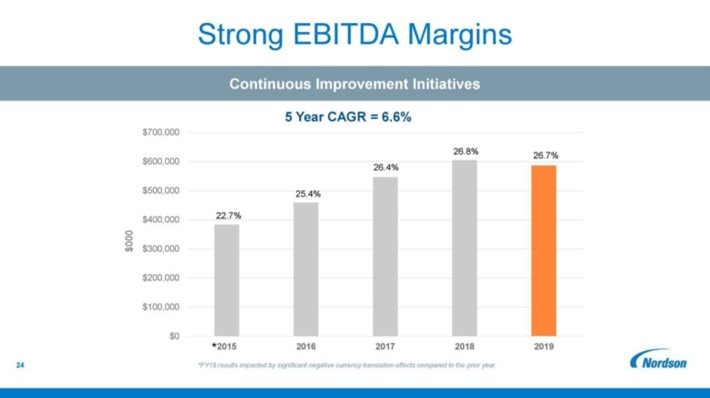 Nordson은 지난 5 년 동안 연평균 6.6 %의 EBITDA 마진을 늘려왔다.