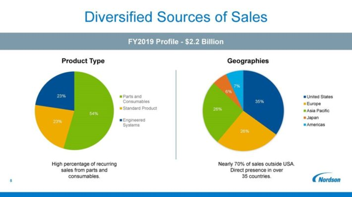 Nordson의 매출 구성은 미국에서 35 % 정도이며 나머지는 글로벌 에서 발생한다. 따라서, Nordson은 다양한 고객 기반과 함께 여러 통화로 매출을 일으키고 있다. 미국은 지리적으로 Nordson의 중요 지역이지만 아시아 태평양과 유럽은 역시 중요한 진정한 글로벌 기업으로 볼 수 있다.