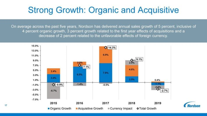 인수에 의한 성장은 장기적인 성공을 위한 어려운 노력이지만 Nordson은 장기적으로 그렇게 할 수 있는 능력을 보여주고 있다. 이것이 투자자가 간과해서는 안되는Nordson의 주요 차별화 요소이다. Nordson의 성장이 다소 굴곡이 있을 수 있지만, 회사의 장기적인 성장 실적은 밝은 미래를 보여준다. Nordson은 수년간 내부 목표와 인수를 통해 강력한 성장을 이루어 왔다.