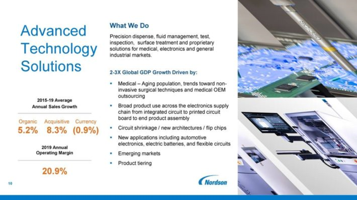 Nordson의 혁신적 역량은 핵심 첨단 기술 시스템 부문에서 확인할 수 있다. 이 부분은 2015 년과 2019 년 사이에 연간 13 %의 매출 성장을 기록했다. 향후 이 사업은 글로벌 GDP 성장률의 2 ~ 3 배의 장기 성장 잠재력이 기대된다.
