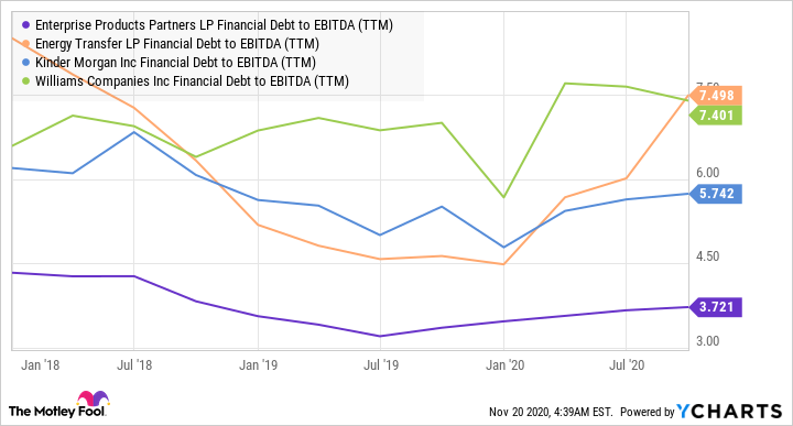 Enterprise Products Partners 는 9.4 % 의 높은 배당수익률로 인해 위험한 주식처럼 보입니다. 그러나 주식은 보이는 것만 큼 위험하지 않습니다. 실제는 가장 보수적으로 관리되는 미드 스트림 (씽크 파이프 라인 및 인프라) 운영자 중 하나입니다. Enterprise Products의 부채 대 EBITDA 비율은 동종 업체 중 가장 낮습니다.