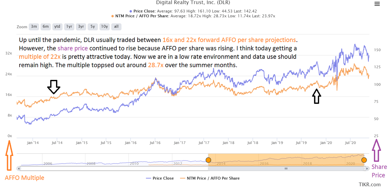 DLR의 배수가 점진적으로 증가했지만 꽤 몇 년 동안 비교적 안정적인 범위 내에서 거래되었음을 알 수 있습니다. 국채 금리가 현저히 낮아짐에 따라 DLR은 더 낮은 "묵시적 상한 금리"로 거래될 것이라고 생각합니다. 즉, NOI (순 운영 수입)에 비해 기업 가치 (주식 + 부채)가 더 높아야 합니다. 이런 일이 발생하면 더 높은 AFFO 배수도 볼 수 있습니다. 결과적으로 앞으로 AFFO 배수의 범위는 2014 년부터 2019 년까지의 범위보다 더 높을 것으로 예상합니다. 16 배에서 22 배까지가 아니라 21 배에서 27 배까지가 앞으로 더 가능성이 높은 범위라고 말할 수 있습니다.