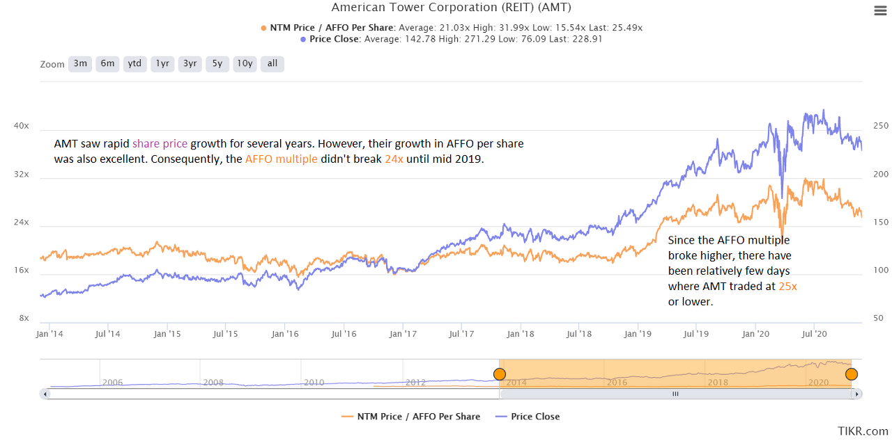 멀티플에 대한 AMT의 차트도 매우 흥미 롭습니다. 주식은 2019 년 중반까지 일정 범위 내에서 정기적으로 거래되었습니다. 그런 다음 범위가 빠르게 바뀌었고 주식은 상당히 높은 배수로 거래되기 시작했습니다. 그 이후로 우리는 그것들을 25 배 이하로 자주 보지 못했습니다.