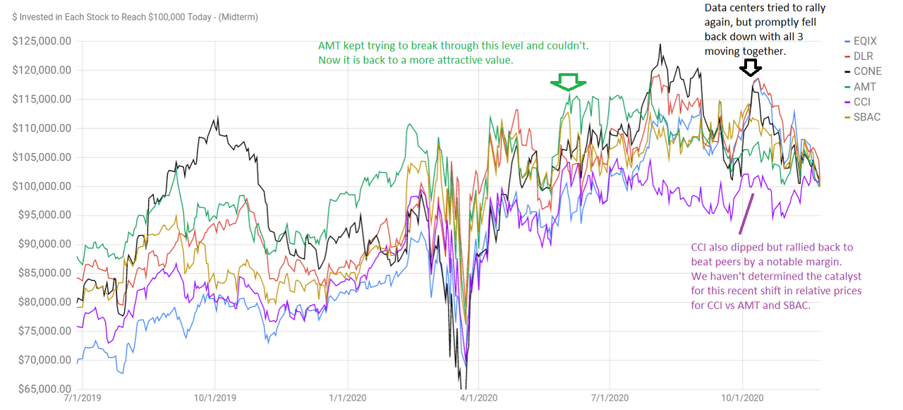 10 월 초, 특히 11 월 초 이후로 투자자들이 "가치"투자에 다시 집중되면서 이러한 고성장 REIT의 성과가 극적으로 저조한 것을 목격했습니다. 이들은 훌륭한 REIT입니다. 그들은 우리가 여름 동안 흥분하기에는 너무 비쌌지만, 최근의 하락세와 많은 시장 상승이 우리의 관심을 끄는 것입니다. 우리는 내년 또는 2 년 동안 여기에서 범위를 확대할 것으로 예상합니다. DLR 및 CONE이 적용되는 경우 가까운 장래에 포트폴리오에 추가할 가능성이 가장 높은 후보는 AMT입니다. 그들은 주주 가치를 제공하는 탁월한 장기 기록을 가지고 있습니다. 배수는 여름철에 비해 감소했으며 훌륭한 대안은 이제 훨씬 적습니다.
