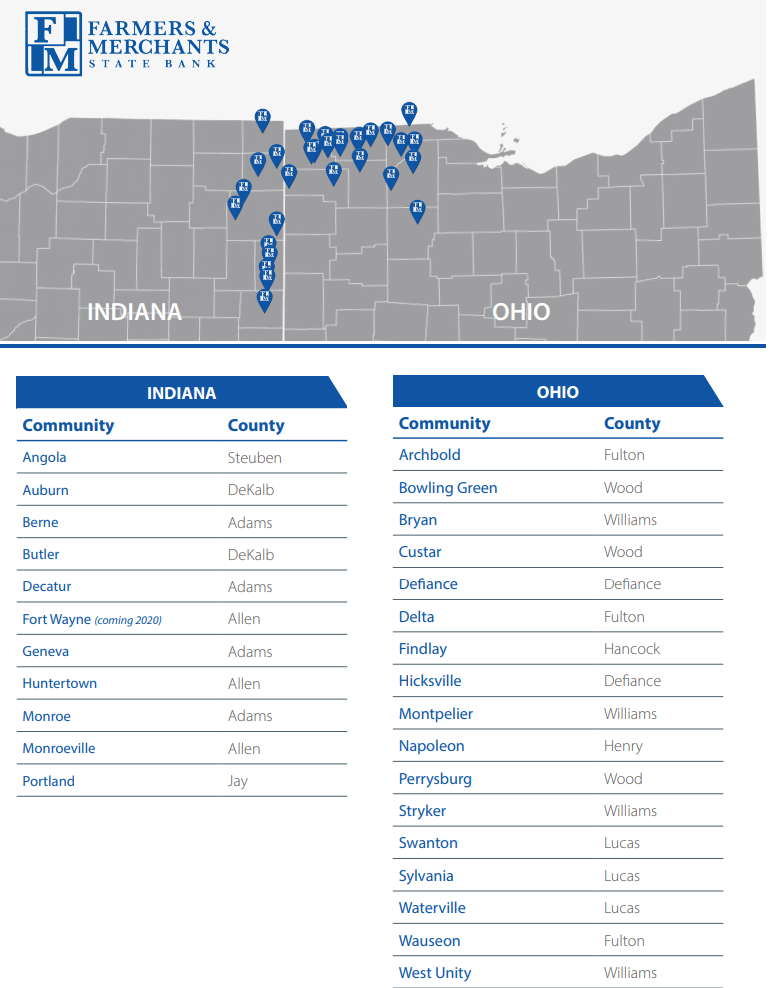 F & M Bank는 1916 년에 설립되었다. 현재 캘리포니아의 센트럴 밸리와 이스트 베이 지역에서 32 개의 지점을 운영하고 있다. F & M Bank는 모든 서비스 – 기업용 대출, 예금, 장비리스 및 재무 관리 상품 이외에도 다양한 소비자 금융 상품도 제공한다.