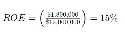 ROE = ($ 1,800,000 / $ 12,000,000) = 15 %