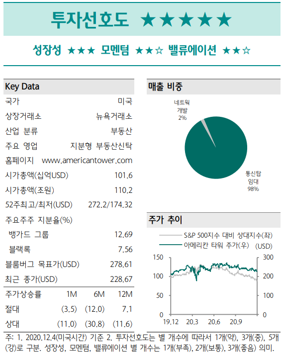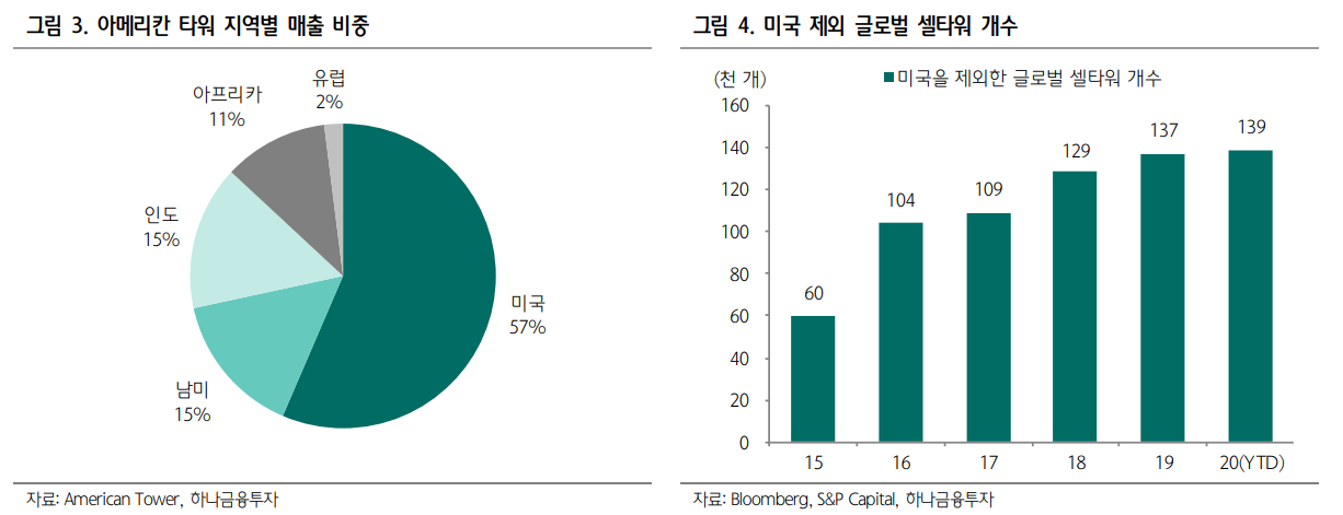 글로벌 통신인프라 임대사업 영위 아메리칸 타워(AMT.US)는 글로벌 최대 통신인프라 리츠로 2020년 3분기 기준 전세계에 17.9만 개의 셀타워를 보유하고 있으며 지역별 매출 비중은 미국 57%, 남미(칠레/콜롬비아/브 라질) 15%, 인도 15%, 아프리카 11% 유럽 2%다. 동사의 미 국 내 포트폴리오는 버라이즌, T-모바일, AT&T 등 미국의 3 대 통신사가 주요 임차인이며 미국 인프라 리츠 중 유일하게 신흥 시장 포트폴리오를 보유하고 있다. 현재 셀타워 외에도 DAS, 엣지데이터센터 등 5G 상용화를 위한 연계 사업들을 영 위하면서 사업영역을 확대하고 있다.