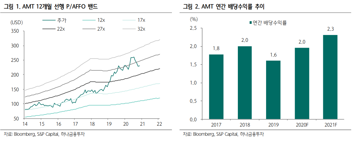 현재 주가는 2021년 선행 P/AFFO 24.9배에 거래 중으로 상 반기 상단인 30배 대비 다소 하락했다. 하지만 신흥국 시장의 불확실성 해소와 더불어 12월 이후부터 5G 투자 가속화가 예 상되는 만큼 장기 성장성이 기대되며 여전히 투자매력 높다는 판단이다