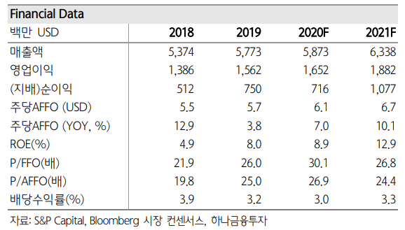 사측은 2021년 매출액 및 주당AFFO 가이던스를 YoY 각각 4%, 10% 성장하는 것으로 신규 제시했다. 2021년 전사 매출 성장 컨센서스가 YoY +6~7%였던 점을 감안하면 탑 라인 성장 은 시장 기대치를 하회한 수준이다. 다만, 2021년 내부 임대수 입 성장(Organic Rental Growth) 가이던스는 YoY +6%로 올해보다 소폭 증가하는 수준이다.