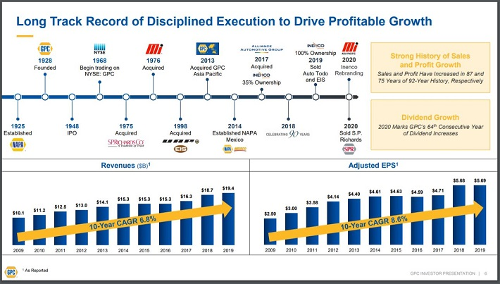작년에 완료된 이 세 가지 인수는 Genuine Parts의 연간 매출에 총 8 억 5,500 만 달러를 추가했다. Genuine Parts의 성장 전략의 결과는 그 자체로 입증된다. 이 회사는 지난 10 년 중 7 년 동안 기록적인 매출을 올렸고 지난 10 년 중 8 년 동안 기록적인 EPS를 보여줬다.