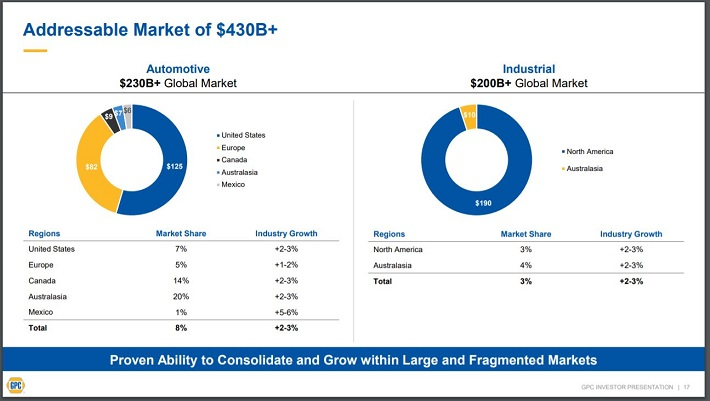 Genuine Parts에 따르면, 6 년 이상 된 차량은 현재 도로 주행 차량의 70 % 이상을 차지한다. 이는 Genuine Parts에게 매우 좋은 지표이다. 또한 자동차 애프터 마켓 제품과 서비스 및 산업 제품에 대한 총 시장 규모 역시 중요한 요소이다.