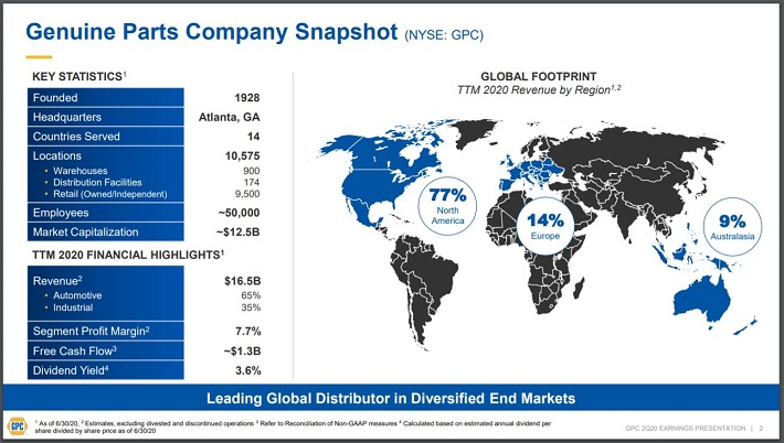 현재 Genuine Parts는 전 세계적으로 10,500 개 이상의 지점을 보유한 세계 최대의 글로벌 자동차 부품 네트워크를 보유한 기업으로 성장했다. Genuine Parts는 2019 년에 약200 억 달러의 수익을 창출했으며 현재 시가 총액은 138 억 달러이다. Genuine Parts는 자동차 교체 부품, 산업용 교체 부품, 사무용품 및 전기 재료를 제조 판매하고 있다.