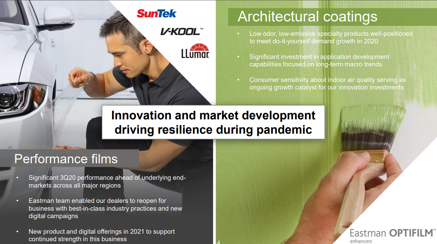 몇몇 다른 산업 이름과 마찬가지로 Eastman은 2020 년 2 분기 우울한 상황 이후에 2020 년 3 분기에 상당한 회복을 보였습니다. 자동차, 건설 및 내구 소비재를 포함한 COVID -19 영향을 받은 최종 사용자에 대한 수요는 2020 년 3 분기에 개선되었습니다.