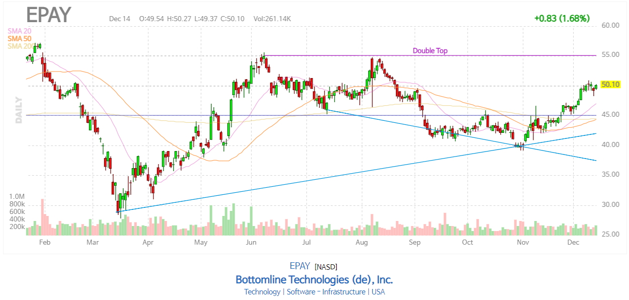 Bottomline Technologies Inc (NASDAQ : EPAY )는 소프트웨어 회사입니다. 현재까지 Bottomline Technologies Inc (NASDAQ : EPAY ) 주가는 8.1 % 하락했으며 12 월 11 일 종가는 49.27 달러였습니다.