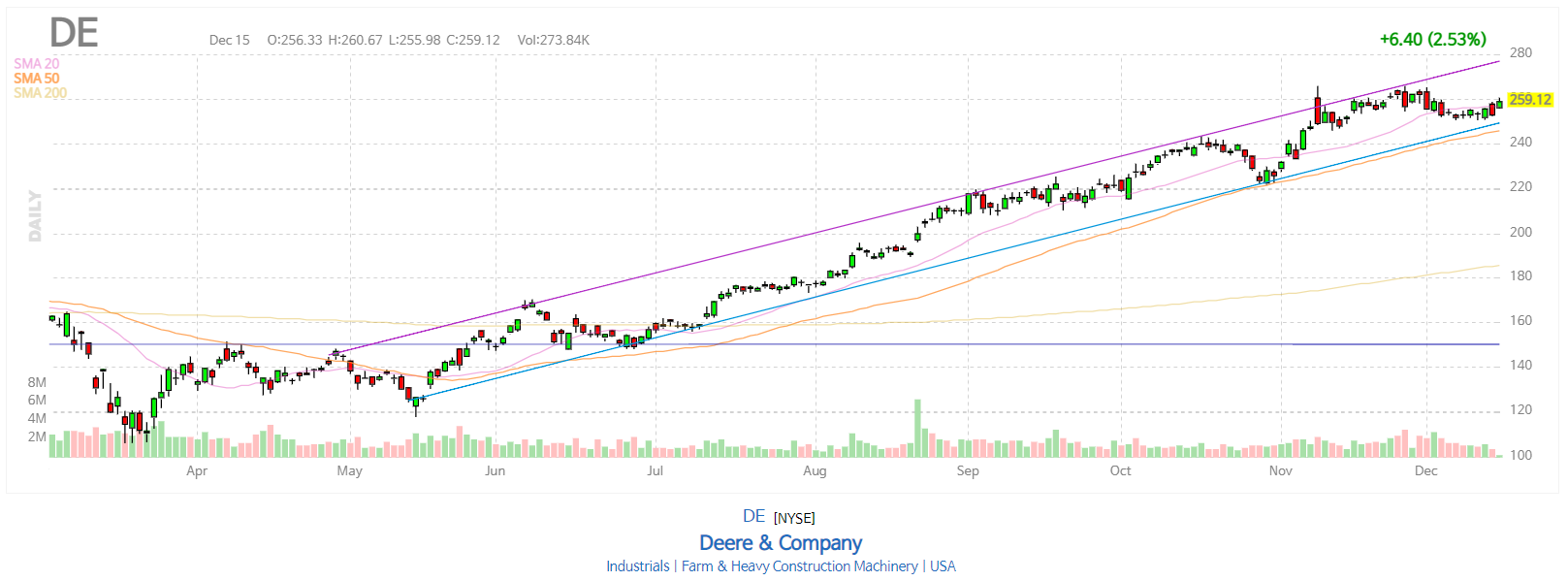 디어 앤 컴퍼니(Deere&Co, DE)는 농업, 건설, 임업 중장비 제조 업체다. 특히 트랙터, 콤바 인, 이앙기 등 농기계 분야에서 전세계 시장을 주도하고 있다.