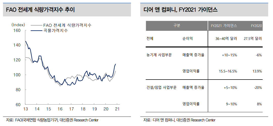 디어 앤 컴퍼니의 FY2021 가이던스에 따르면 순이익은 36~40억 달러(+31~45% yoy), 영 업이익률은 15.5~16.5%(FY2020 13.3%, FY2019 10.6%)가 예상된다.