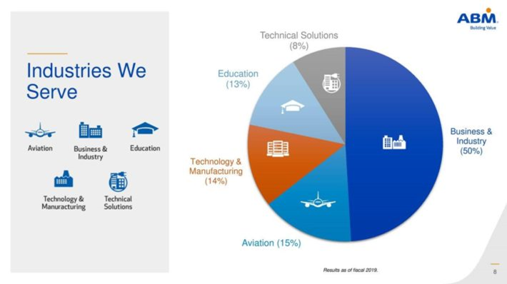 ABM은 비즈니스 및 산업, 교육, 항공, 기술 및 제조, 의료, 기술 솔루션 등 다양한 시설 솔루션 등 6 개 부문으로 나뉜다. 회사의 수익 흐름은 ABM의 이중 청소 서비스는 가장 큰 규모를 차지한다.
