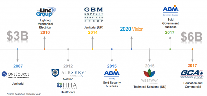 ABM은 지속적으로 인수를 하고 있으며, 아래 그림은ABM을 현재 위치에 있게 한 최근 인수 및 매각을 보여준다.