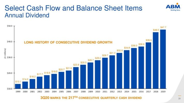 ABM은 또한 탁월한 배당 성장 기록을 가지고 있다. 이 회사는 217 분기 연속 배당금을 지급했으며 50 년 이상 연속 배당금을 인상했다. 배당왕!