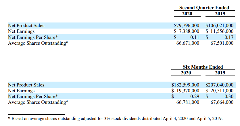 Tootsie Roll은 또한 제조 시설 고정된 운영 비용이 발생하기 때문에 올해 2 분기 와 마찬가지로 매출이 감소하면 수익성이 저하된다. 매출은 COVID-19 폐쇄로 인한 소매점의 수요 감소로 2 분기에 25 % 낮아졌다. 순이익은 주당 17 센트에서 주당 11 센트로 약 1/3 감소했다.