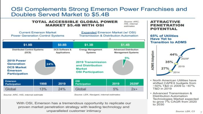 에머슨은 또한 최근 Open Systems International을 16 억 달러에 인수했습니다. 이번 인수를 통해 에머슨은 글로벌 전력 산업의 고객에게 기술 소프트웨어를 제공할 수 있게 되었으며, 따라서 회사의 전체 접근 가능한 글로벌 전력 시장은54 억 달러로 두배 수준이 될 것이다.