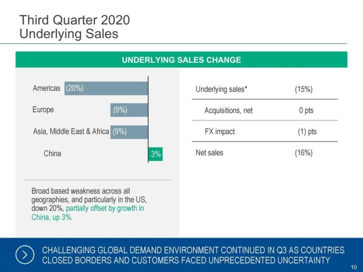 에머슨은 미주 지역에서 수익이 20% 로 가장 크게 감소했다. 유일하게 밝은 점은 중국이었는데, 이는 대유행 회복에서 다른 지역보다 앞서 있어 에머슨이 이 지역에서 3 %의 매출 성장을 달성하는 데 기여했다.