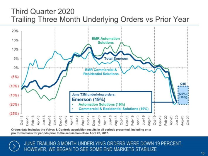 에머슨은 현재 코로나 바이러스 위기로 인해 또 다른 침체에 직면해 있다. 전염병으로 인해 올해 전 세계 석유 제품 수요가 급감하고 에너지 부문이 크게 하락했기 때문이다. 에머슨은 이번 경기 침체로 인해 상당한 타격을 받았다. 회계 연도 3 분기 기준 자동화 솔루션의 매출이 13 % 감소하고 상업용 및 주거용 솔루션의 매출이 19 % 감소함에 따라 기본 매출이 15 % 감소했다.