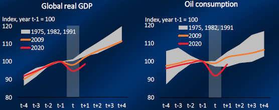 경기 후퇴기 동안 세계 GDP와 오일 소비 추세 비교