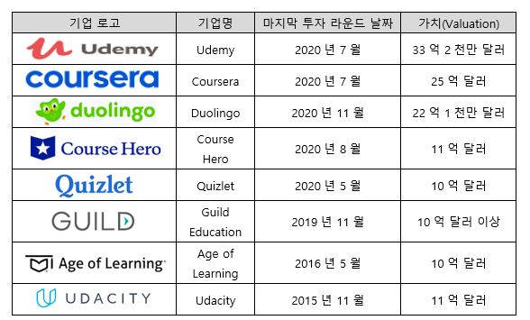 코로나19 확산으로 앞에서 언급한 듀오링고 같은 에듀테크 기업이 크게 성장하고 있으며, 2020년 12월 기준 에듀테크 분야 유니콘 기업은 모두 8개이다.