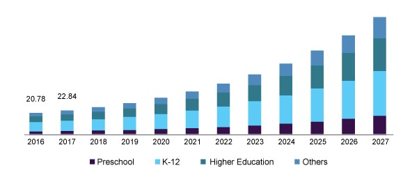 글로벌 시장조사기관 Grand View Research에 따르면, 글로벌 에듀테크 시장 규모는 2019년 764억 달러로 평가됐고 2020년 890억 7000만 달러에 이를 것으로 전망했다. 그리고 2020년부터 2027년까지 연평균성장률(CAGR) 18.1%로 성장해 2027년에 2852억3000만 달러에 도달할 것으로 예측했다. 북미지역은 2019년 38.2%의 가장 큰 비중을 차지했으며, 2027년까지 선두를 유지할 것으로 전망했다.