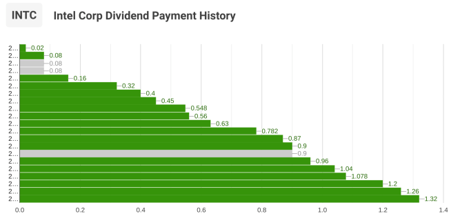 배당 성장 : 사실 배당 성장은 약간 왜곡되어 있습니다. 아래 차트를 참조하십시오. 본질적으로 회사는 2014 년부터 매년 배당금을 늘렸습니다. 단, 동일한 배당금이 지급되었던 2013-2014 년 시대의 1 년을 제외하고는 2014 년부터 매년 시작됩니다. 인텔의 평균 배당 성장률은 6.5 %에서 7 % 사이입니다!
