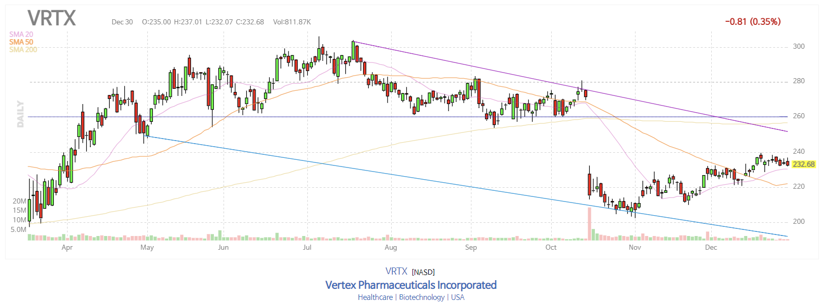 Vertex Pharmaceuticals Inc (NASDAQ : VRTX )는 바이오 제약 회사입니다. 현재까지 Vertex Pharmaceuticals Inc (NASDAQ : VRTX ) 주식은 6.6 % 상승했고 12 월 29 일 종가는 $ 233.49였습니다.