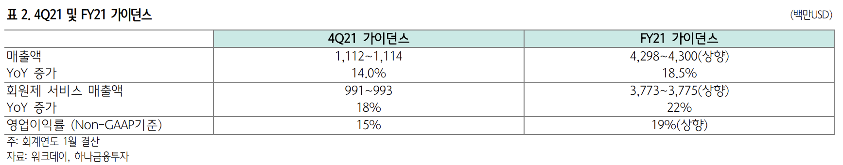 4분기 가이던스는 매출액 11.1억 달러(+14%), 회원제 매출액 9.9억 달러(+18%), 조정 영업이익률 15%다. 워크데이는 코로 나19 불확실성과 전년동기 높은 기저를 반영하여 4분기 회원제 기반 수주잔고 가이던스를 +14~16%로 제시했다(-8%p yoy).