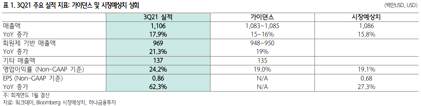 FY21년 3분기(10월결산) 실적은 매출과 이익 모두 시장 예상치를 상회하는 호실적을 기록했다. 매출액은 11.1억 달러 (+18% yoy), 조정 EPS 0.86 달러(+62%)다. 회원제 기반 매 출액이 9.7억 달러(+21.3%)로 20% 넘는 성장을 기록하며 가 이던스(+19%)를 크게 상회했다.