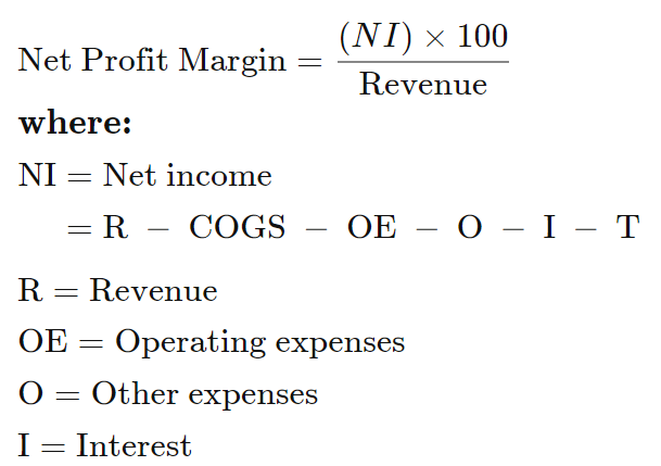 수익(매출) 증가가 반드시 수익성 증가로 이어지지는 않기 때문에 순 수익성은 중요한 지표입니다. 순이익은 총 이익 (수익에서 COGS를 뺀 값)에서 운영 비용과 부채에 대해 지불한 세금 및 이자와 같은 기타 모든 비용을 뺀 값입니다.