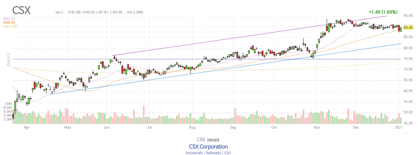 CSX Corporation은 북미 지역의 철도 운송 및 부동산에 중점을 둔 미국 지주 회사입니다. 2020 년 3 분기에 회사는 2019 년 같은 기간에 8 억 9500 만 달러 또는 주당 1.08 달러에 비해 순이익이 7 억 3600 만 달러 또는 주당 0.96 달러라고 발표했습니다.
