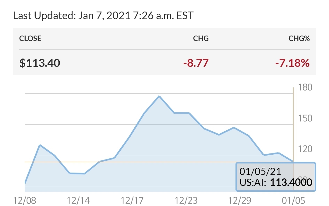 그러나 C3.ai 주식은 그 이후로 낮게 거래되고 있습니다. 주가는 2021 년 첫 거래일에 13 % 이상 급락했습니다. 여러 연구 회사가 인공 지능 회사에 대한 취재를 시작한 후 하락했습니다. 예를 들어, Morgan Stanley는 최근 주당 100 달러의 목표 주가와 함께 주식에 대해 "Underweight"등급을 발표했습니다. 긍정적 인면에서 Wedbush는 C3.ai에 대해 주당 200 달러의 목표 주가로 "Outperform"등급을 발표했습니다.