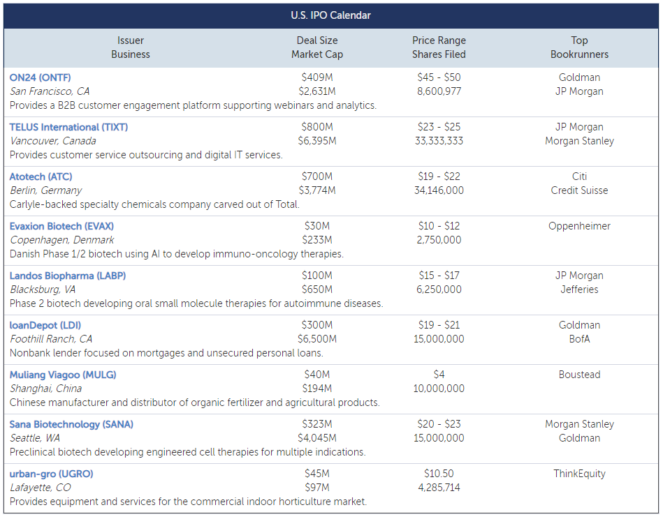캐나다 디지털 서비스 제공 업체 TELUS International ( TIXT )은 시가 총액 64 억 달러로 8 억 달러를 모금 할 계획입니다. 이 회사는 고객 서비스 아웃소싱 및 엔드 투 엔드 고객 경험과 디지털 기술 솔루션 및 서비스를 제공합니다. 빠르게 성장하고 수익성이 있는 TELUS는 9 개월 동안 매출이 53 % 증가했습니다. 회사는 NYSE와 TSX에 이중 상장을 계획하고 있습니다.