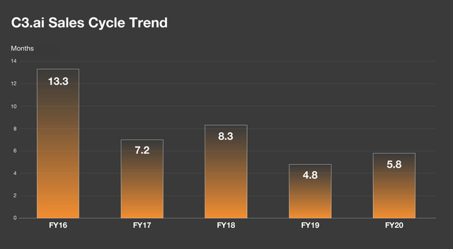 대부분의 IT 부서의 주요 초점이 원격 작업 인 불확실한 대유행 환경에서는 거래가 실패하거나 완전히 손실되는 것을 쉽게 확인할 수 있습니다. 그러나 여기서 좋은 소식은 C3.ai가 AI 및 클라우드 제품의 수용이 더욱 확산됨에 따라 판매 주기가 점차적으로 단축되었다는 것입니다 (6 개월은 여전히 나머지 소프트웨어 부문에 비해 매우 긴 기간 임). 아래 차트는 C3.ai의 거래 주기가 시간이 지남에 따라 어떻게 단축되었는지를 보여줍니다.