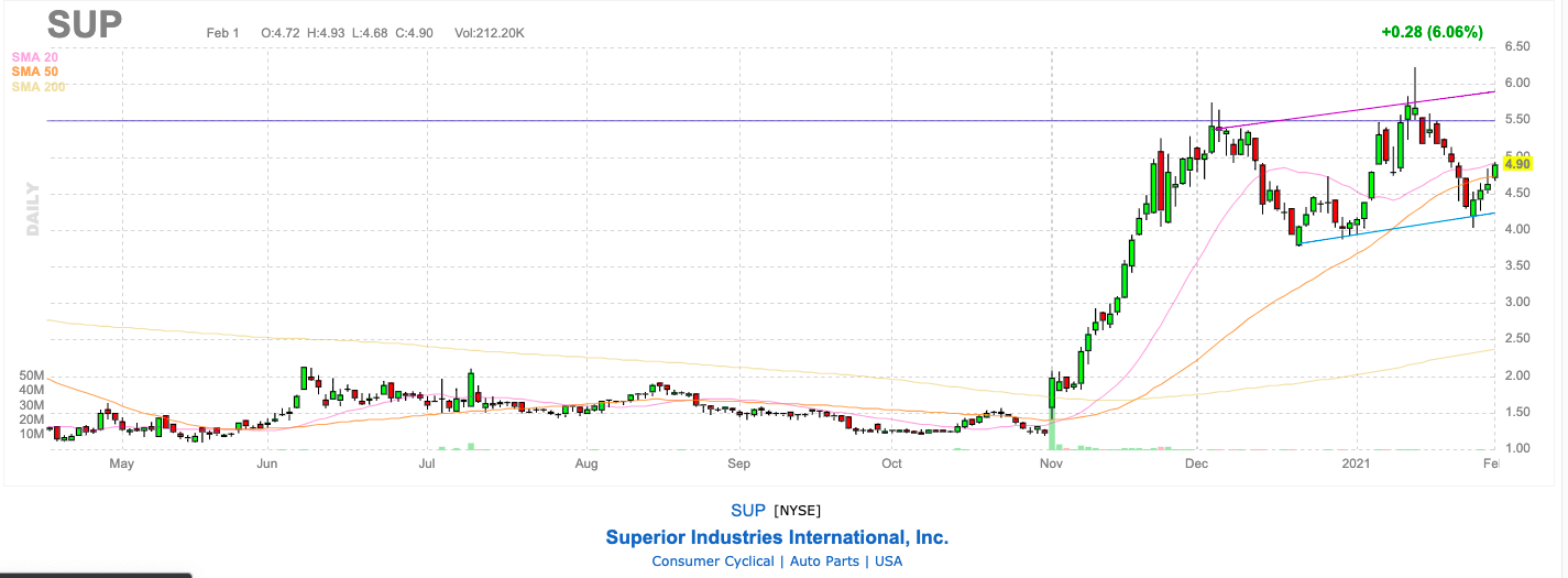 Superior Industries International, Inc. 는 자동차 부품 및 액세서리를 설계, 수정 및 생산하는 회사입니다. 현재 시가 총액은 1 억 2,230 만 달러입니다. 지난 3 개월 동안 SUP는 142.64 % 의 막대한 수익을 냈으며 1 월 29 일 마감 시 주당 4.62 달러로 정산되었습니다.
