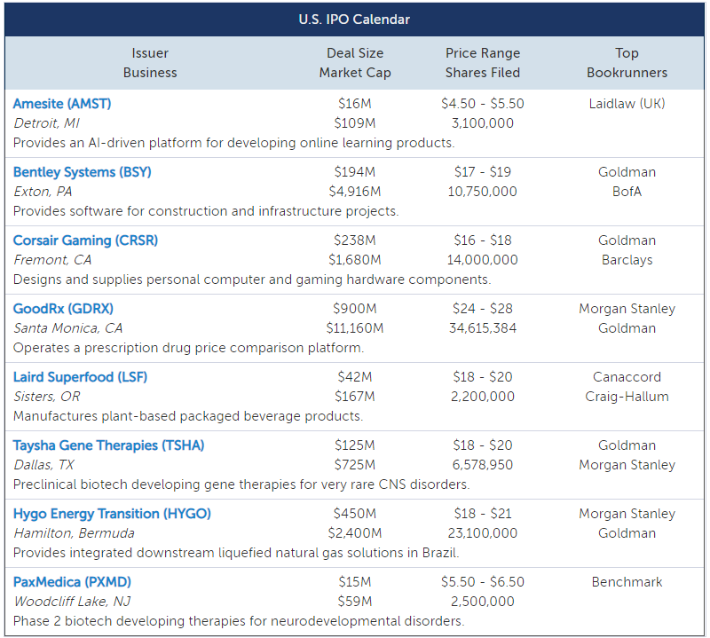, which provides software for construction and infrastructure projects, plans to raise $194 million at a $4.9 billion market cap. The IPO float is just 4.1% of the basic shares outstanding, or 3.3% after indicated buying. Operating in a cyclical market, the company has delivered profitability with strong margins. The company’s operations were impacted by COVID-19 as usage declined due to delays in construction projects. Bentley Systems plans to pay a quarterly dividend.