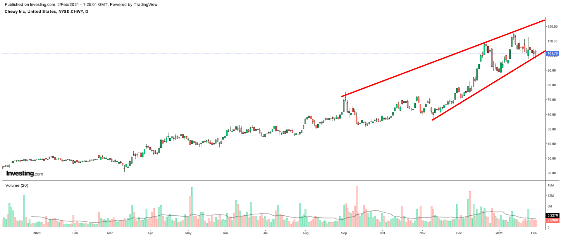 1 월 15 일 115.23 달러로 사상 최고치를 기록한 CHWY 주식은 화요일 101.76 달러로 마감되어 플로리다에있는 애완 동물 전자 상거래 회사 인 Dania Beach가 428 억 달러의 가치를 얻었습니다.
