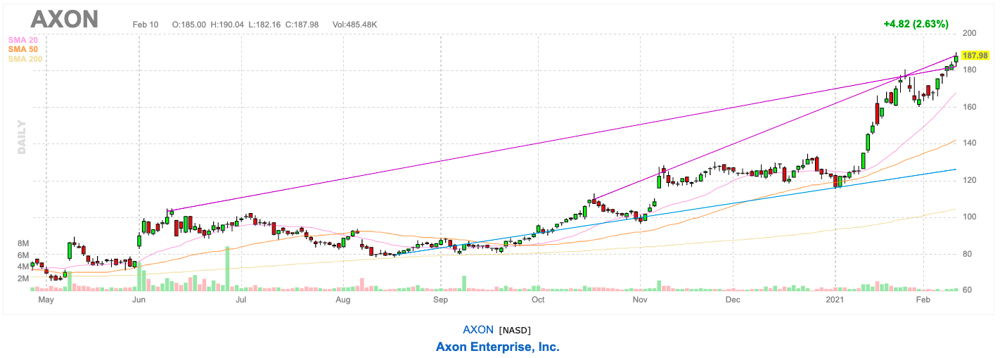 Axon (NASDAQ : AXON ). 이 회사는 테이저를 만드는 데 사용되었습니다. 실제로 그 이름은 Taser International이었습니다. 그런 다음 회사는 바디 카메라를 판매하기 시작했습니다. 그런 다음 경찰 기관을 디지털화하기 위한 클라우드 호스팅 소프트웨어 서비스 제품군으로 사업을 확대했습니다. 그 결과 Axon은 이제 법 집행(경찰, 공권력) 기술 분야에서 독보적인 리더로서 독보적이며 향후 10 년 동안 전 세계의 모든 공공 안전 기관을 디지털화할 수 있는 강력한 위치에 있습니다.