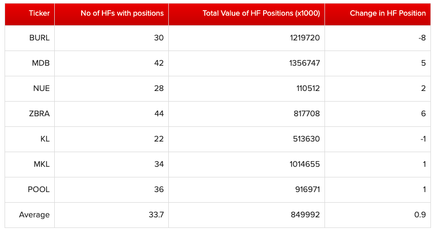 Magna International Inc. (NYSE : MGA)와 유사한 다른 주식의 헤지 펀드 활동을 살펴보겠습니다. 이러한 주식은 Burlington Stores Inc (NYSE : BURL ), MongoDB, Inc. (NASDAQ : MDB ), Nucor Corporation (NYSE : NUE ), Zebra Technologies Corporation (NASDAQ : ZBRA ), Kirkland Lake Gold Ltd. (NYSE : KL ), Markel Corporation (NYSE : MKL ) 및 Pool Corporation (NASDAQ : POOL ). 이 주식의 시장 밸류에이션 그룹은 MGA의 시장 밸류에이션과 유사합니다.