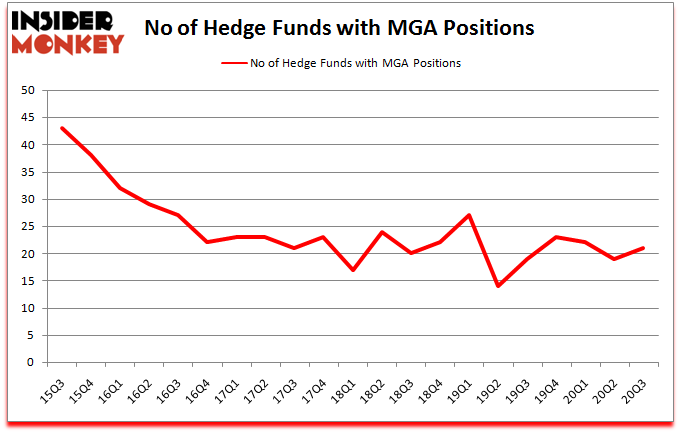 2020 년 4 분기를 앞두고 Insider Monkey가 추적 한 총 21 개의 헤지 펀드가 이 주식에서 매수 포지션을 유지했으며 이는 전분기 대비 11 % 변동 한 수치입니다. 아래 그래프는 지난 21 분기 동안 MGA에서 강세를 보이는 헤지 펀드의 수를 보여줍니다. 따라서 주식의 최고 보유자 중 어떤 헤지 펀드가 있었고 어떤 헤지 펀드가 큰 움직임을 보이고 있는지 살펴보겠습니다.