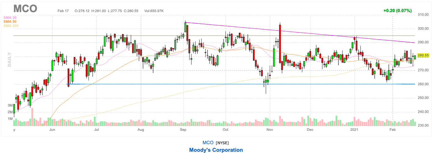 Moody 's 12 월 분기 매출은 12 억 9 천만 달러로 5 % 가까이 증가했으며 분석가들의 예상치 인 7 천만 달러를 넘어섰습니다. 또한 FY 2020 희석 주당 순이익은 전년 대비 27 % 증가한 $ 9.39입니다. 회사는 FY 2021 희석 EPS가 $ 9.70에서 $ 10.10으로 예상되고 조정 희석 EPS는 $ 10.30에서 $ 10.70 범위에 있을 것으로 예상됩니다.