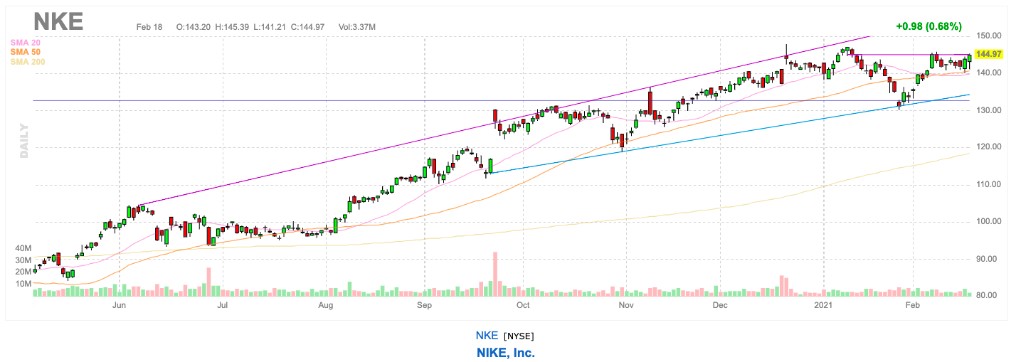 지난해 3 월 바닥부터 12 월 31 일까지 NKE 주가는 괄목할만한 125 % 상승했습니다. 사람들이 점차 새로운 표준에 적응함에 따라 임의 소매업에서 가장 강력한 브랜드가 눈에 띄었습니다. 또한이 기간 동안 정기적인 치료가 큰 인기를 끌었 음을 감안하면 제품 구매는 약간의 소매 치료를 제공했습니다.